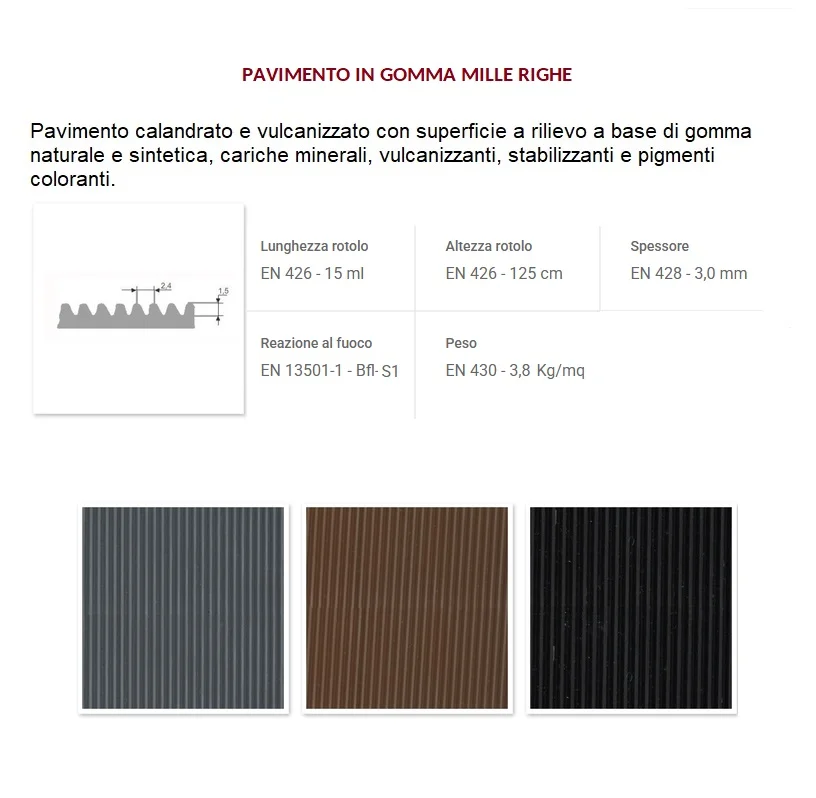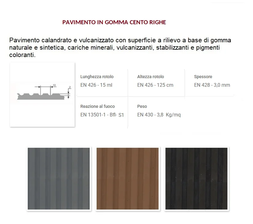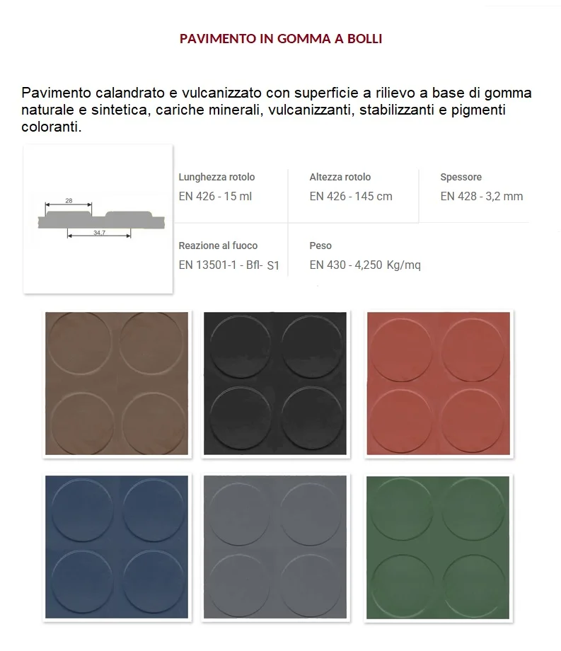 Realizzati in gomma naturale e sintetica con additivi stabilizzanti, i pavimenti sono forniti n diverse finiture superficiali: a bolli, scanellata, mille righe o liscia.