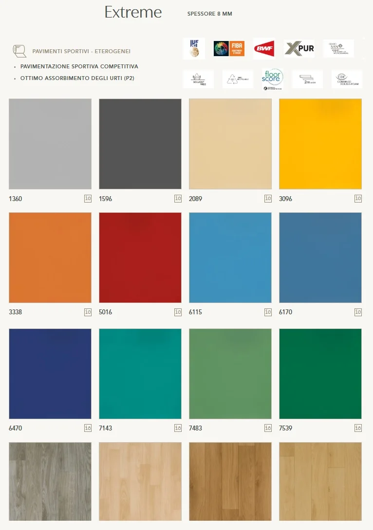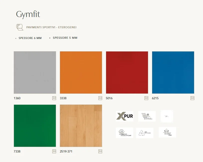La gamma sportiva propone rivestimenti in PVC progettati per ambienti ad alto utilizzo: palestre scolastiche, istituti formativi e strutture sportive competitive. Grazie a supporti in schiuma chiusa, superfici ad alte prestazioni e tecnologie di facile manutenzione, questi pavimenti offrono comfort, sicurezza e resistenza nel tempo.
