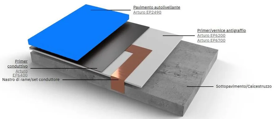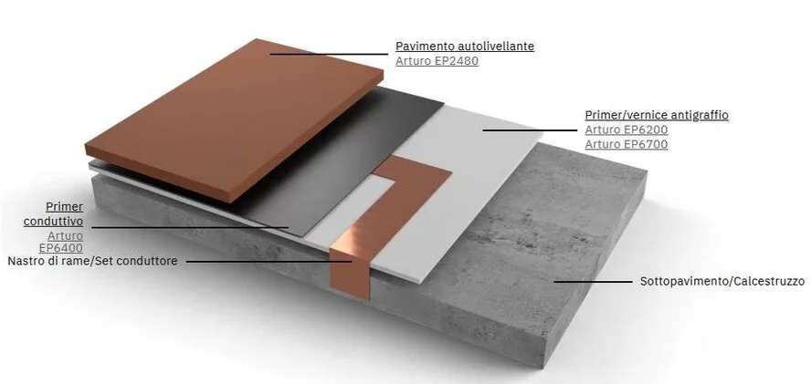 Sistema di pavimentazione epossidica autolivellante, elettricamente conduttivo,