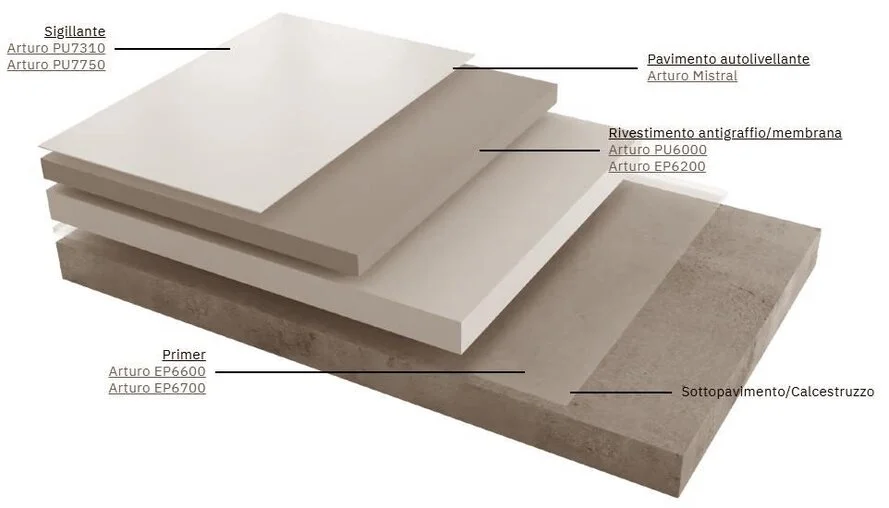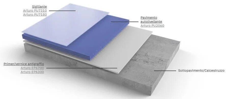 - Sistema di pavimentazione: Multistrato a base epossidica